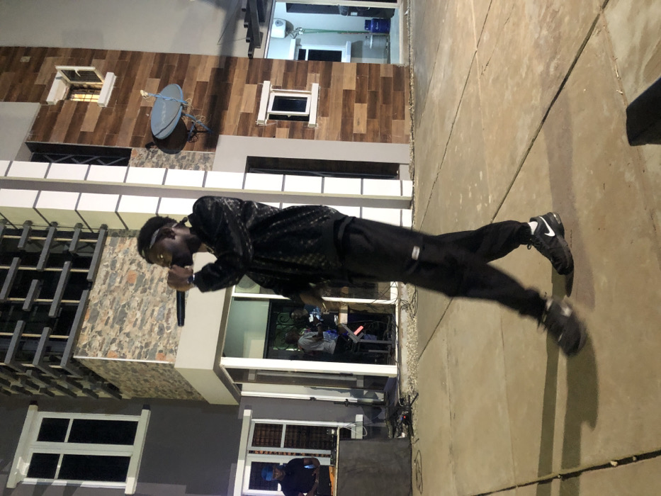 A man dressed in black holds a microphone while performing outdoors. A building is to the left with large windows, and another man can be seen inside sitting at some kind of mixing machine. The ground is concrete, and the photo appears to be taken at night. A satellite dish is attached to the side of the building.