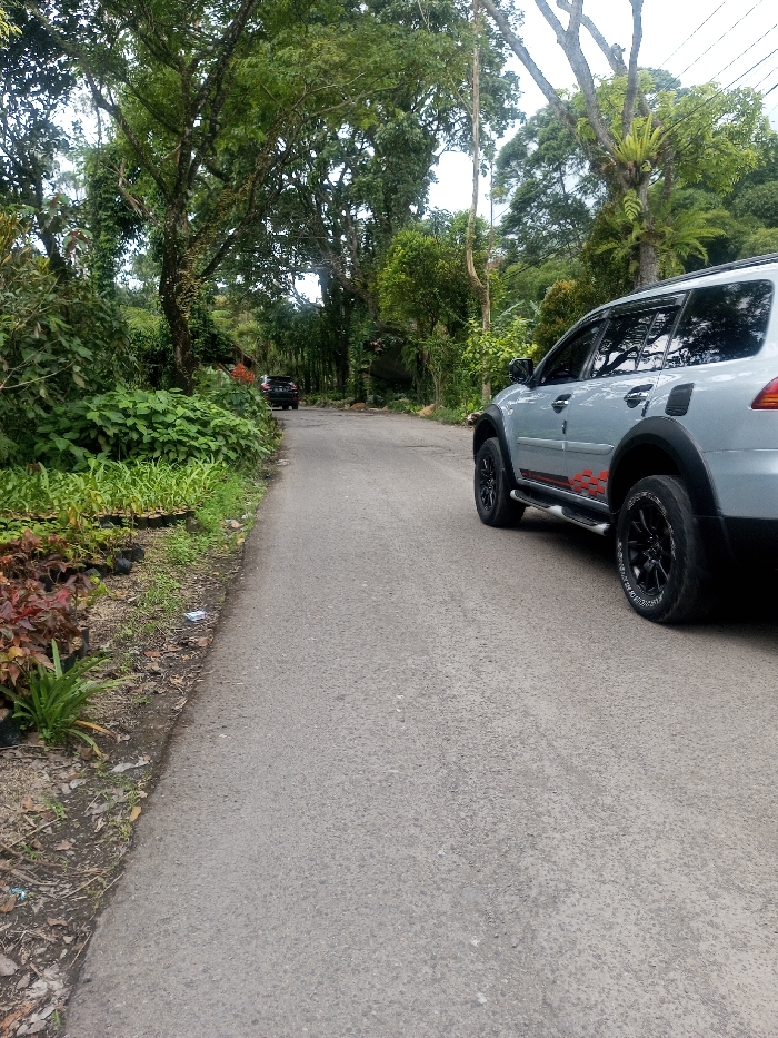 The scene captures a paved road in a heavily vegetated area, specifically Unknown, Vietnam. In the foreground, positioned on the right side of the asphalt, is a light grey Mitsubishi Pajero Sport SUV. This vehicle features black fender flares, black side steps, black multi-spoke wheels, and red graphic decals on its lower body panels. The road, a grey, textured asphalt surface, recedes into the background, curving gently to the left. Along the left edge of the road, a narrow dirt verge hosts numerous potted plants and seedlings, including species with green and reddish-brown foliage, suggesting a roadside nursery or planting area. Both sides of the road are densely bordered by tall, broadleaf trees with abundant green foliage, some displaying epiphytic ferns. In the far distance, down the curving road, a dark-colored sedan or SUV is partially visible. The overhead sky is largely obscured by the dense tree canopy. No individuals are present, and no explicit actions or interactions are depicted.