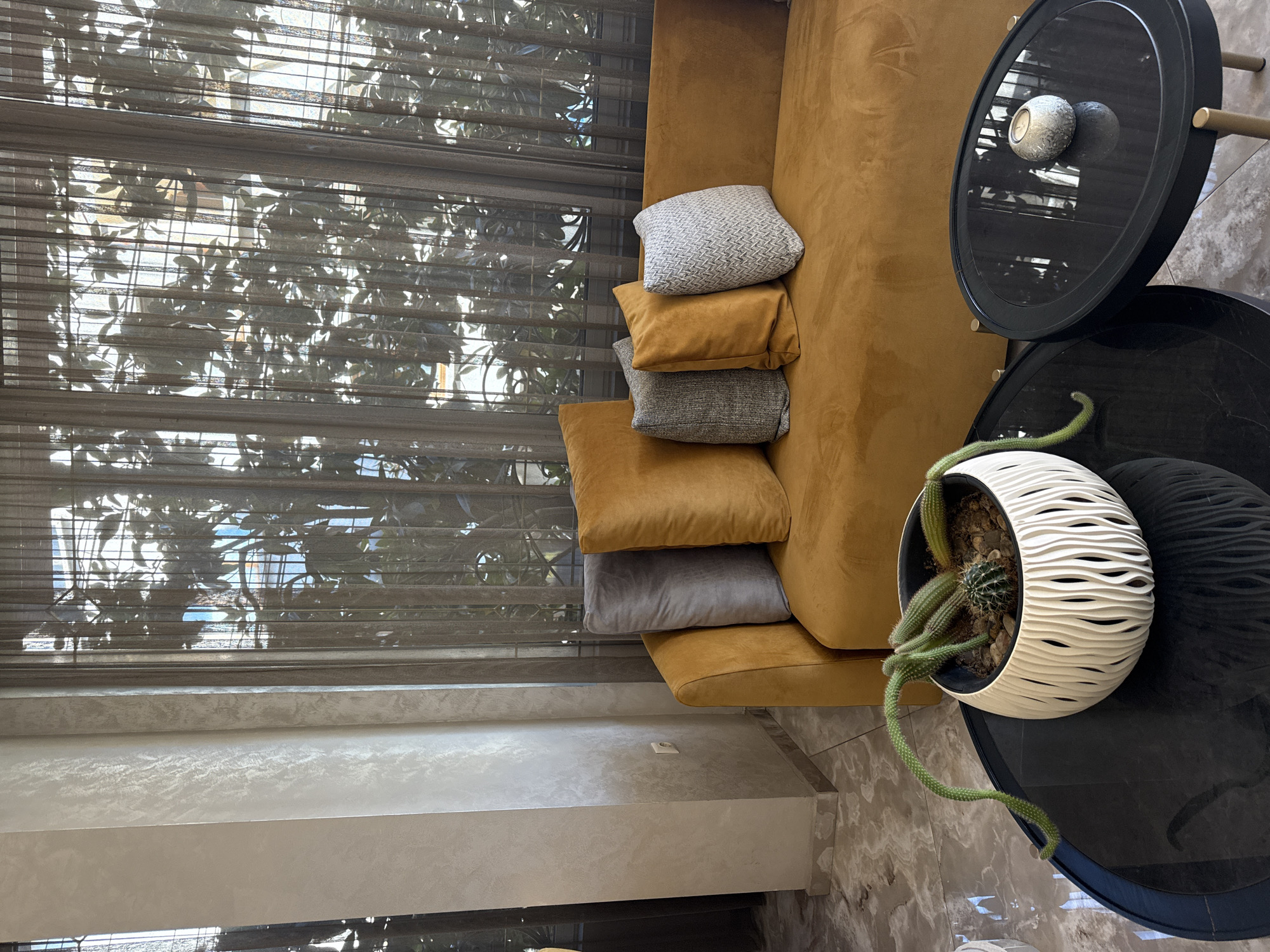 A high-angle, indoor shot shows part of a room with furniture and a potted plant. The room appears to be located in Petrich, Bulgaria, based on architectural styles and common interior design elements found in the area. The main features include: * **Furniture:** A portion of an ochre-colored sofa with several pillows in gray and ochre tones. Next to the sofa, there are two stacked, round tables with a black, glossy surface. * **Plant:** A white, decorative pot on the lower table contains a cactus. Long, thin, green tendrils emerge from the pot and drape over the edge of the table. * **Window and Light:** A window covered with semi-transparent blinds is visible in the background. The sunlight filters through the blinds and foliage outside, creating a pattern of light and shadow on the wall and floor. * **Flooring:** The flooring appears to be marble. * **Wall:** There is a baseboard along the wall to the left of the image.
