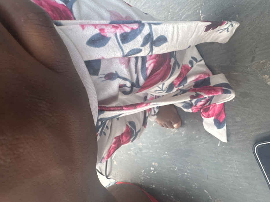 This image, captured in Ado, Nigeria, presents a close-up, top-down perspective focusing on parts of an adult and a child. A dark-skinned adult arm dominates the upper frame, positioned over a white inner garment border. Below this, a child is visible, wearing a loose white garment patterned with pink roses and dark green foliage. One bare, light brown child's foot, with discernible toes, extends from beneath the floral fabric, resting on a grey concrete floor. The floor surface exhibits minor scuff marks and light particulate matter. A small red object is partially visible on the far left edge of the frame. In the lower-left corner, the corner of a black smartphone with a dark screen is present.