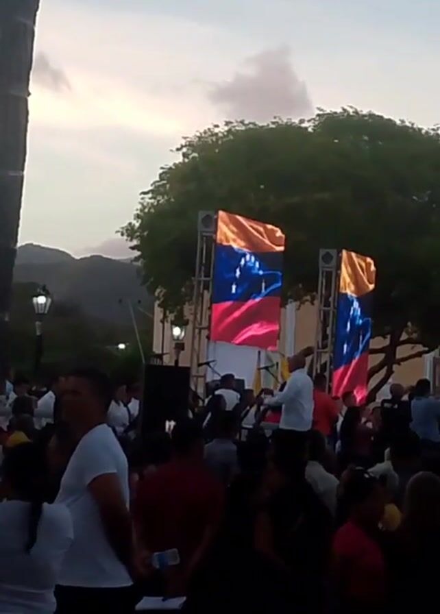 - "A crowd has gathered in a plaza, with two large video screens displaying the flag of Venezuela" by FM-JFdun1, licensed under CC BY 4.0