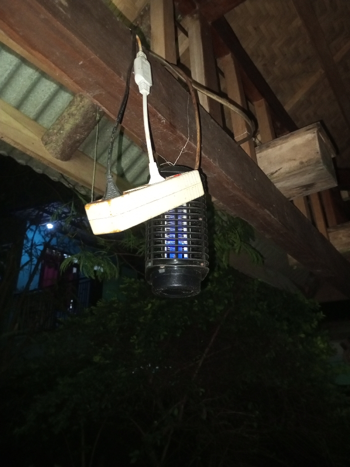 The scene depicts a nighttime outdoor or semi-outdoor environment in Naya Andura, India. A black, cylindrical insect zapper, emitting a blue internal light, is centrally positioned and suspended below a wooden beam. Power to the zapper is supplied via a black electrical cord plugged into a white, multi-outlet power strip, which is also suspended from or secured near the wooden beam. A white power adapter is plugged into an adjacent outlet on the same power strip, and a long, light-brown electrical cable is draped over the wooden beam. Above and to the left, corrugated metal roofing is visible. Additional wooden structural elements, including a small wooden box-like structure, are observable in the upper right quadrant. Below and in the background, dense, dark green foliage is present. A faint blue light emanates from an unidentified structure in the distant background. No human subjects are depicted.