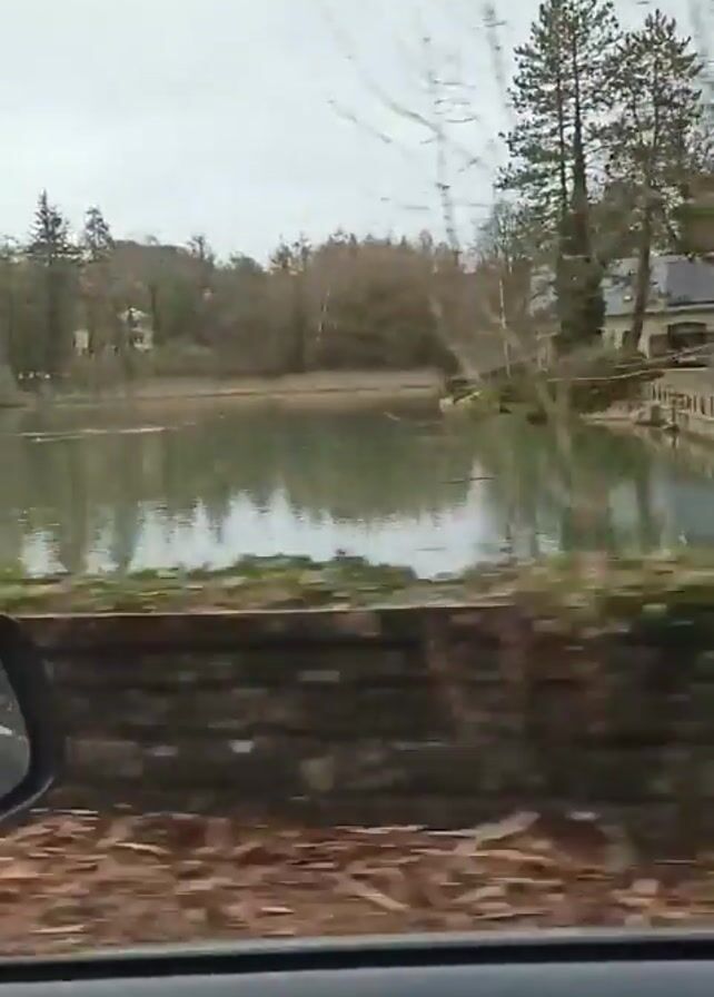 The view from a car passes by a calm lake surrounded by trees on an overcast day. The car moves across a bridge with a low stone wall, offering a glimpse of a quaint house on the lake's edge. The background is blurred, emphasizing the stillness of the lake and the natural setting.