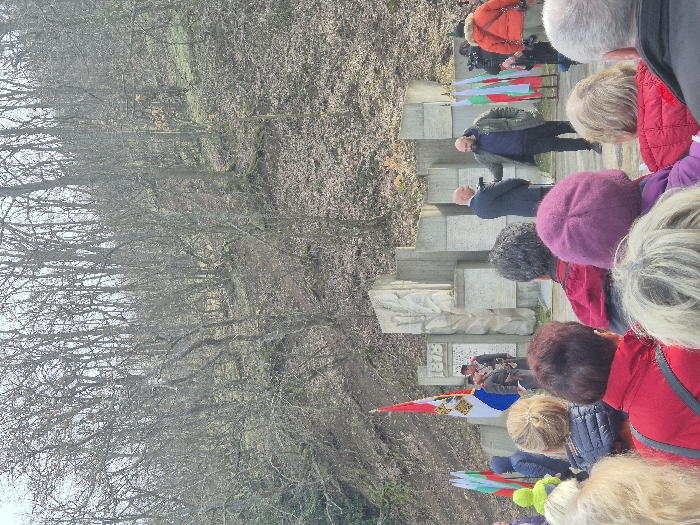 The image depicts an outdoor commemorative event at a memorial site in Chargan, Bulgaria