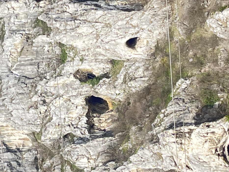 The image displays a rugged rock face within the city of Lyutibrod, Bulgaria, characterized by prominent grey and white rock formations. Three distinct dark cave entrances are visible: one large, irregular opening in the mid-left, a smaller, darker, roughly circular opening situated above and slightly right of the first, and a third, oval-shaped opening in the mid-right section. Sparse, dry deciduous vegetation with bare branches and small patches of green foliage cling to the rock surface and crevices, primarily in the lower and mid-sections. No individuals are present. Two thin, horizontal wires, likely utility lines, traverse the lower-mid portion of the frame, partially obscuring the rock and vegetation. The scene is illuminated by natural daylight.