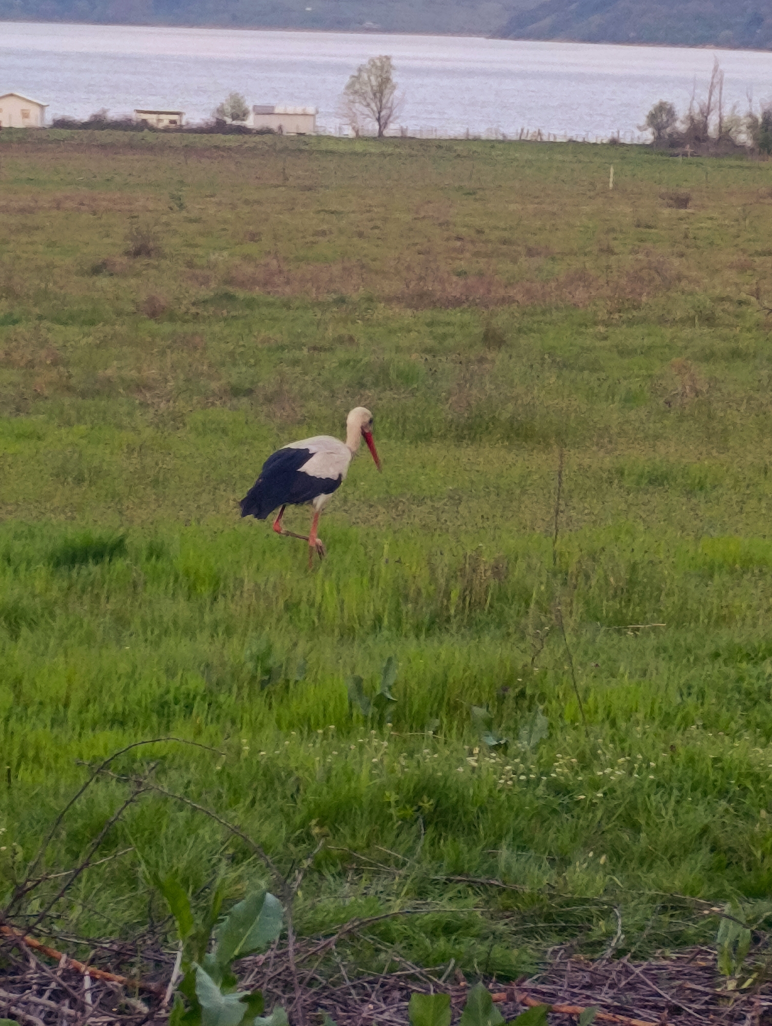 stork in a grassy field. In the background, there is a body of water, possibly a lake or river, with some buildings visible on the far shore. The buildings are small and simple in design. The scene is likely located in Shiroko pole, Bulgaria, as specified. The stork is the primary subject, standing in the green grass. It is mostly white, with some black feathers on its wings and a red beak. The environment is a rural landscape with a body of water in the background.