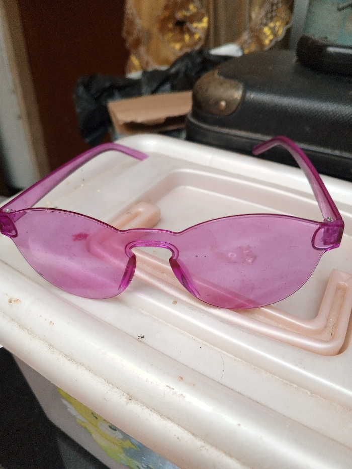 Pink sunglasses with a thin, transparent frame sit atop a dirty, ribbed white plastic surface. The lenses are a matching light pink hue and show minor smudges. A vintage-looking black suitcase with brass hardware is visible in the background. Discarded items or packaging can be seen obscured behind the suitcase. The image conveys a sense of forgotten or discarded items.
