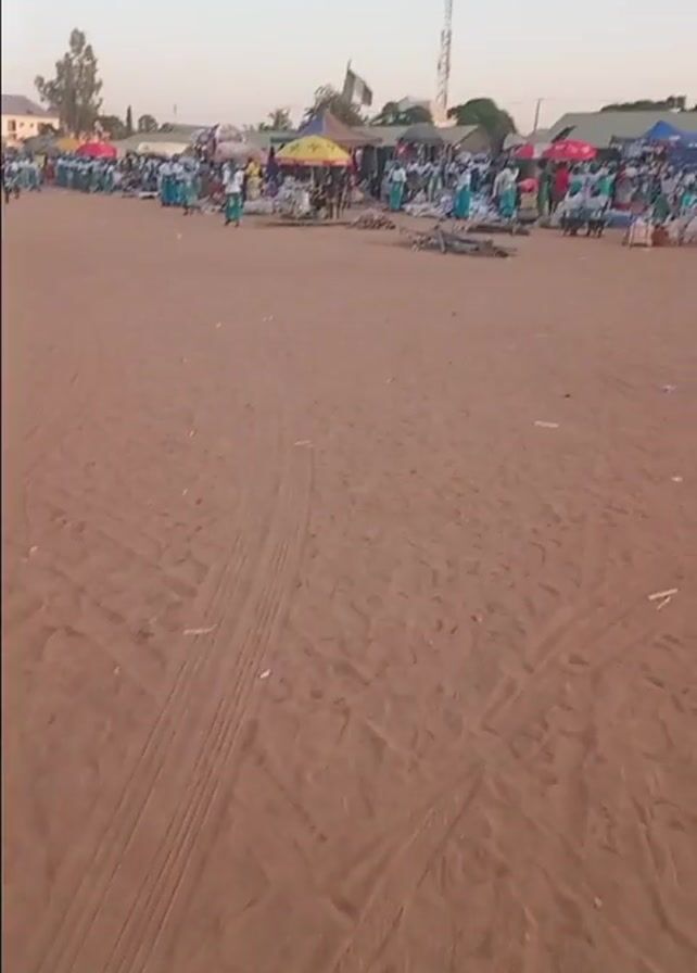 sandy area with a crowd of people gathered in the distance. Most of the people in the crowd are wearing similar outfits of blue and white. There are a few men visible walking amongst the crowd, and cars are also present. The area appears to be open, with some buildings and trees visible in the background. The sky is light blue.