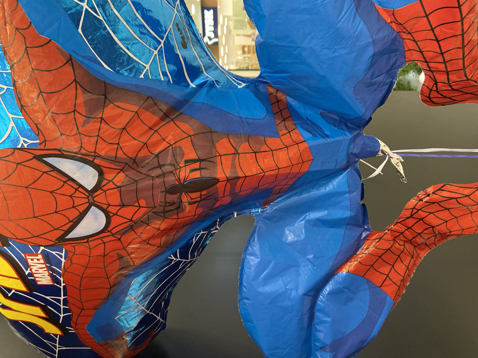 A large, three-dimensional fabric or semi-inflated display of the Marvel character Spider-Man dominates the foreground