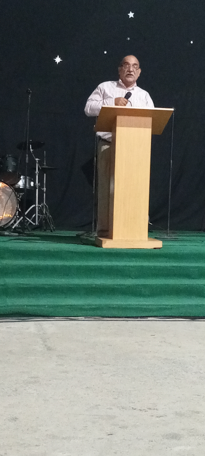In Duaca, Venezuela, an indoor scene displays a stage setup. A mature adult male with glasses and a light-colored, vertically striped, long-sleeved shirt stands behind a light wooden podium. He is actively speaking, holding a black handheld microphone. To the left and slightly behind the podium, a partial drum kit is visible, comprising a bass drum and cymbal stands with cymbals. A black microphone stand is also positioned near the drum kit. The stage floor is covered in a dark green, horizontally ridged material, while the immediate foreground consists of a light gray concrete or tiled floor. A dark cable runs along the juncture between the stage and the foreground floor. The backdrop behind the speaker is dark fabric, adorned with several irregularly placed white five-pointed star decals of varying sizes.