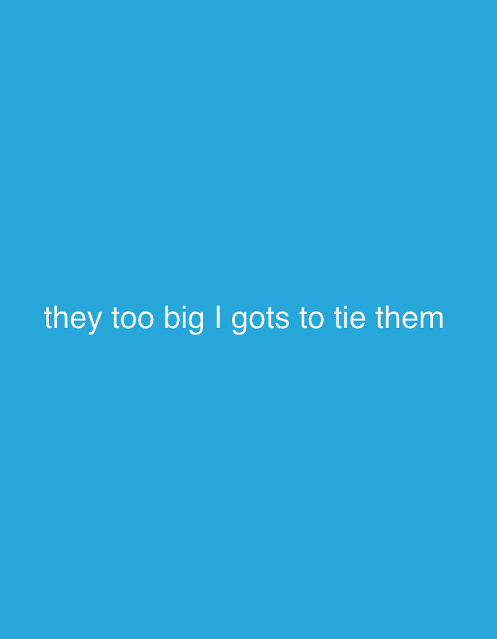 The scene is a static digital graphic with a uniform medium-blue background. White, sans-serif text, horizontally centered and positioned slightly below the vertical midline, displays the phrase: "they too big I gots to tie them". The image is an abstract composition, containing no discernible physical environment, individuals, objects, actions, or interactions that would identify a specific geographical location within Tonbridge and Malling, United Kingdom, or any other region.