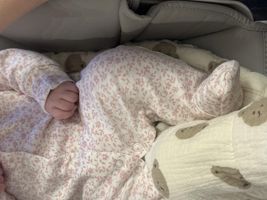 A baby is visible from the mid-torso down, with their right hand curled into a fist, resting in an infant carrier or bassinet