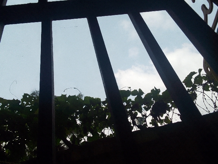 The scene is an upward-angled view through dark, silhouetted structural elements, likely a window grille or gate, at an outdoor environment in Unknown, Unknown. Four prominent vertical and diagonal bars frame the view. An ornate metallic detail is present in the upper right corner. Below these bars, dense green foliage, consisting of leaves and tendrils, is visible in silhouette, with a palm frond partially discernible on the left. The background is a light blue sky with white clouds. No persons are present. No specific actions or interactions beyond plant growth around the structure are evident.