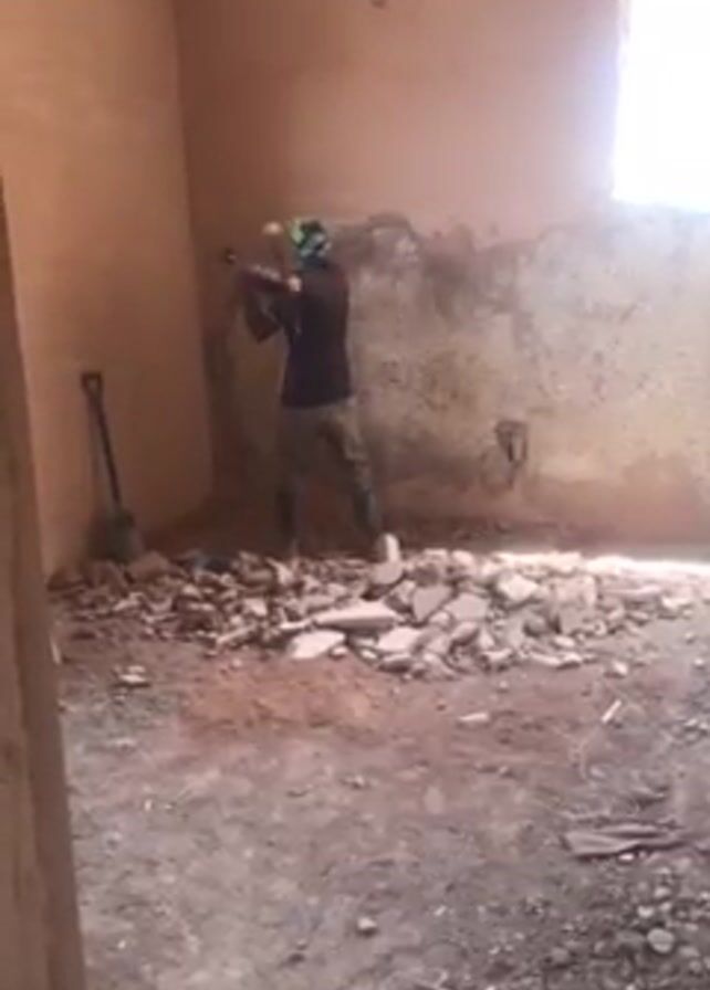 Inside a dusty room under renovation, a person wearing a dark shirt, olive-drab pants, and green head covering uses a long-handled hammer to chip away at a weathered, light-tan plaster wall