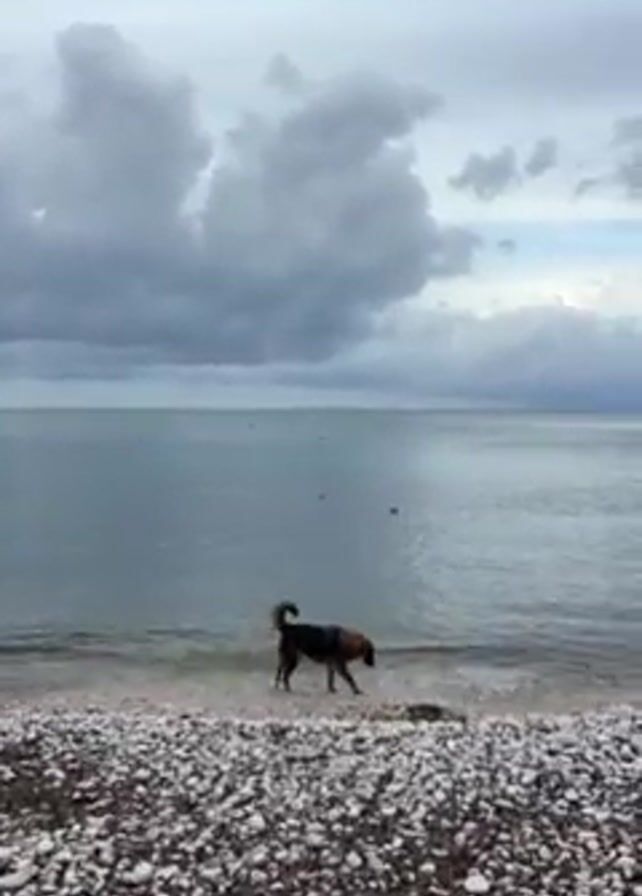 dog walking along a rocky beach. The dog is medium-sized, with dark fur on its back and lighter fur on its belly. It is wearing a red collar. The beach is covered in white and gray pebbles. The water is calm and gray, and the sky is overcast with dramatic clouds. There is a rocky outcrop visible in the distance to the right. The camera is static and the shot is wide, capturing the dog and the surrounding environment.