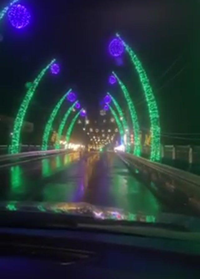 The video depicts a night drive through a town decorated with Christmas lights. The camera is positioned inside a car, looking out through the windshield. It is raining and the street is wet, reflecting the festive lights. Arched structures illuminated with green lights line the road, each adorned with a purple, spherical ornament. In the distance, more lights are visible, including what appear to be snowflake-shaped decorations. The wiper blades of the car are active, intermittently clearing the rain from the windshield.