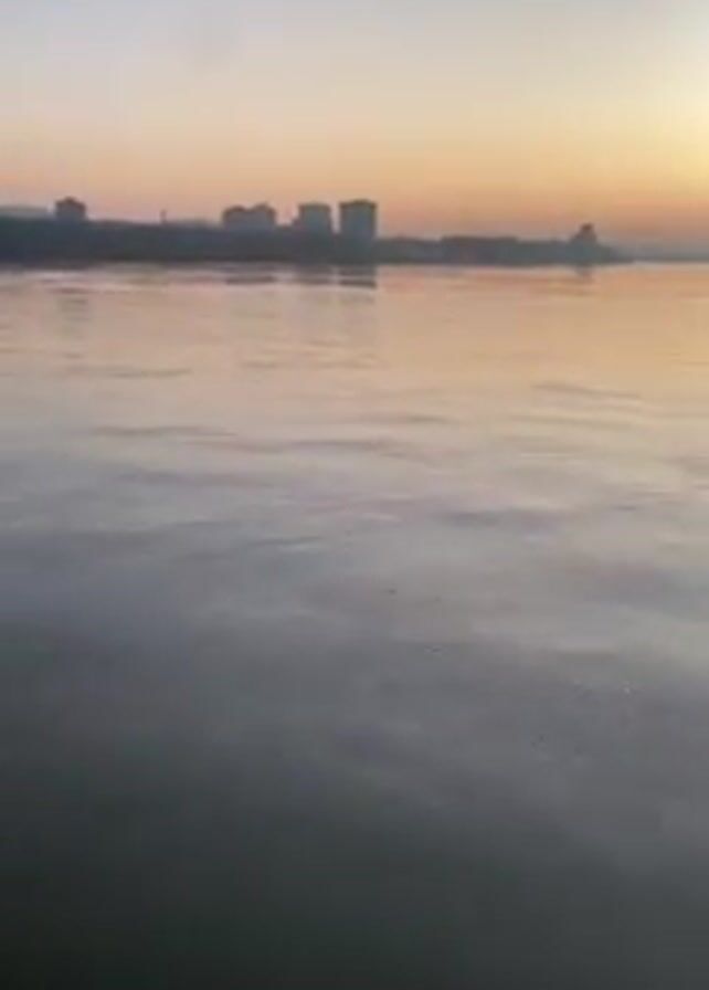 wide river at sunset or sunrise. The sky is pale with a gradient of color, transitioning from light orange to blue. On the horizon, there is a city skyline silhouetted against the sky, with taller buildings and what appears to be a tower visible. The water is calm with subtle ripples, reflecting the sky's colors. As the video progresses, the camera pans slowly to the right, revealing a long stretch of land covered with trees, also silhouetted in the distance. A faint contrail from an aircraft is visible in the upper right part of the frame.