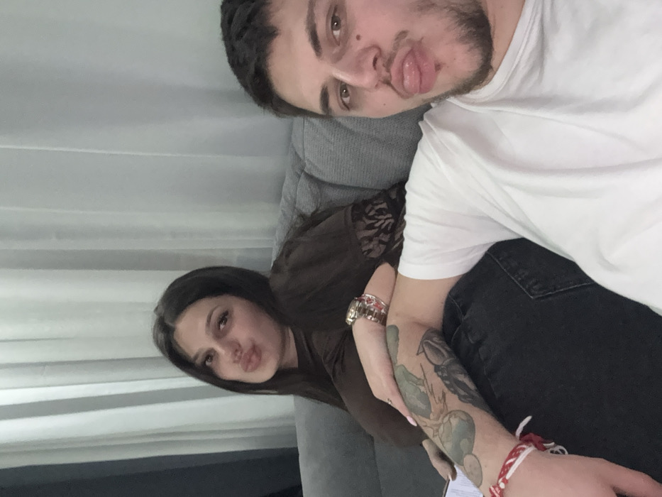 A selfie-style image displays two individuals, one female and one male, seated on a grey upholstered sofa in an indoor environment, reportedly in the city of Zhiten, Bulgaria. The female, positioned on the left, has long dark hair and wears a dark brown long-sleeved top with lace detailing on the sleeve. She wears multiple bracelets on her left wrist and maintains a pose with pursed lips. Her left hand rests on the male's tattooed left forearm. The male, positioned in the foreground on the right, has short dark hair and light facial stubble, wearing a white short-sleeved t-shirt and dark trousers. His left forearm is extensively tattooed, and he wears red and white string bracelets on his wrist. He poses with his tongue slightly extended from his mouth. A light-colored, possibly white or grey, curtain serves as the background.