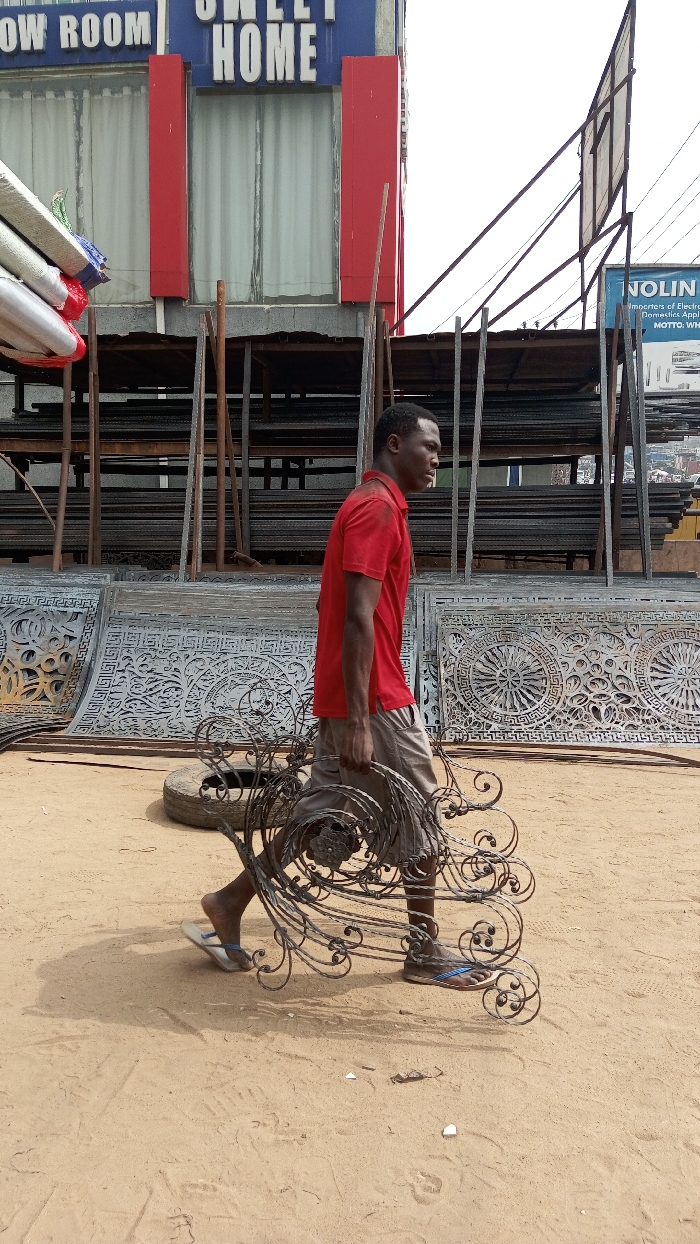 An adult male is depicted walking from left to right across unpaved, sandy ground in Awkuzu, Nigeria. He wears a red polo shirt, light-colored shorts, and blue and white flip-flops, carrying several dark, intricately scrolled metal decorative pieces in his right hand. His shadow and that of the objects are cast on the ground. The immediate background features stacked ornate metal panels with geometric and floral patterns, alongside a discarded tire and a large metal rack holding numerous horizontal metal bars. In the upper background, a building with a blue facade and red vertical accents displays "OW ROOM" and "SWEET HOME" in white lettering, with white curtains visible in its windows. To the right, a metal billboard structure stands, showing a partial sign with text including "JOLIN" and "IMPORTERS of Electronics, Domestics Appliances." The scene is outdoors under bright, daylight conditions.