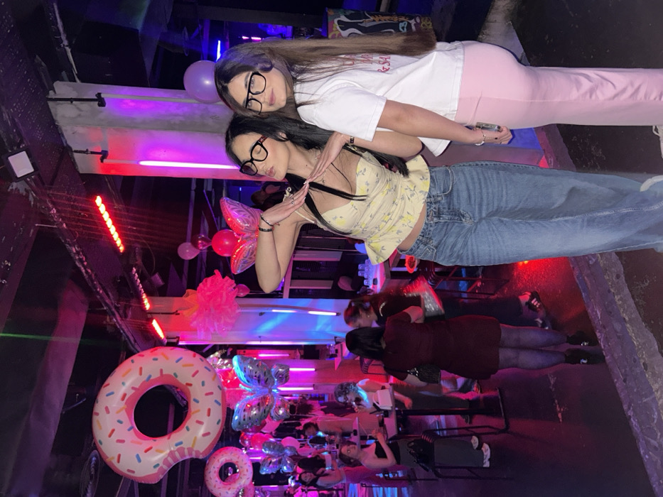 The image depicts an indoor entertainment venue, likely a nightclub or bar, situated in Varna, Bulgaria. The environment is dark, illuminated by artificial lighting, primarily in shades of pink, purple, and red. Red LED strip lights are visible on the ceiling, complementing vertical light strips affixed to exposed concrete pillars. Two young adult females are prominently featured in the foreground, posing towards the viewer. The female on the left has long dark hair, wears black-framed glasses, a light yellow peplum-style camisole with a repeating pattern, blue wide-leg jeans, and multiple rings and bracelets. Her arms are raised, with hands near her face, forming a stylized gesture, and her lips are pursed. The female on the right has long brown hair, wears black-framed glasses, a white short-sleeved t-shirt with faint black text on the right side, and light pink trousers. She faces the camera with a slight smile. The venue is decorated with multiple large inflatable objects, including a white donut with colorful sprinkles dominating the upper left, a smaller donut further back, and several silver-blue and pink butterfly shapes. Pink fluffy pom-pom decorations and various balloons, including red and purple, are also suspended throughout the space. In the mid-ground and background, approximately 15-20 additional individuals, predominantly young adults, are visible. They are engaged in social interactions, standing or seated at high-top tables with drinks. One individual in the mid-ground is observed from behind, wearing a dark red short-sleeved dress, dark hosiery, and heels. The flooring appears dark and uniform.