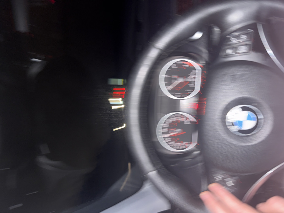 interior of a car, specifically a blurred view of the steering wheel and dashboard. The steering wheel has the BMW logo in the center. The dashboard features two circular gauges with red needles. The image is blurry, suggesting motion, possibly taken while the car was in motion. Part of a hand is visible at the bottom right of the image. The left side of the image is dark and indistinct, but appears to be the exterior view through the car window.