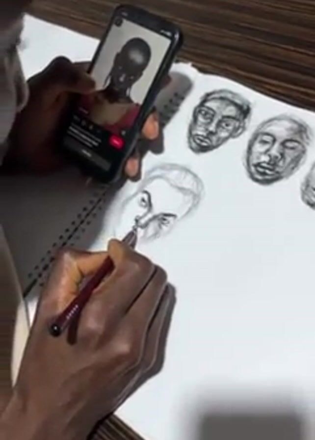 A person is drawing a face from a reference photo on their phone. The phone is held in the left hand, while the right hand holds a pencil and sketches on a spiral-bound sketchbook. There are several other face sketches already on the page. The background is a wooden table.