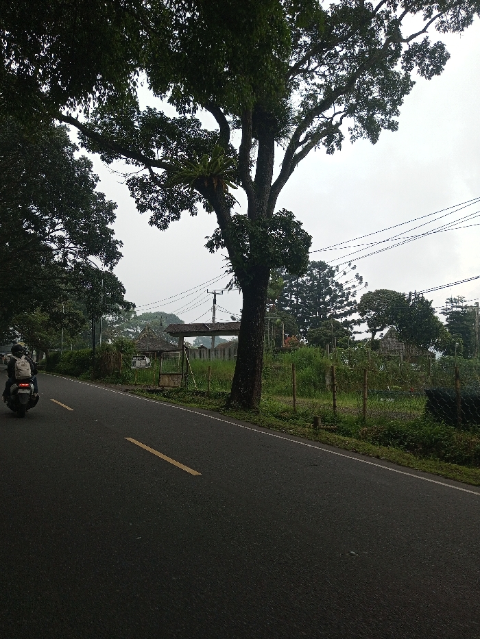 The image portrays an outdoor scene in Sandamal Eliya, Sri Lanka, under an overcast sky. A dark asphalt road, marked with a single yellow dashed line, occupies the left and central foreground. A solitary individual, wearing a dark helmet, a dark jacket, and a light-colored backpack, is seen operating a dark scooter, traveling away from the camera on the left side of the road. To the right of the road, a large, mature tree with extensive dark green foliage and epiphytic plants on its branches stands prominently. Beyond this tree and to the right, an overgrown field or lot is enclosed by a wire fence supported by wooden posts. In the midground, behind the fence, a small, open-sided structure with a light-colored roof is visible. Overhead, utility poles and multiple dark electrical wires are present against the bright, grey sky, extending across the upper right portion of the image. Further trees and indistinct structures are visible in the distant background.