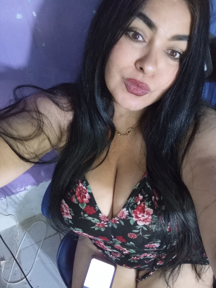 A single female individual is depicted in an indoor setting within the city of Unknown, State of Unknown. The subject, positioned for a selfie-style photograph, has long, dark hair, dark eyebrows, and brown eyes. Her lips are made up with dark red lipstick, forming a slight pout as she looks directly into the camera. She wears a black garment with a floral pattern featuring red and pink flowers and green leaves, exposing cleavage. A gold-colored chain necklace with a circular pendant is visible on her neck. Her right shoulder is partially visible on the left side of the frame. In the lower center, a smartphone with an illuminated screen rests on her lap or near her midsection. A white cable with a USB-A plug is visible on a light-colored surface in the lower-left foreground. The background consists of a plain, muted purple wall on the left.