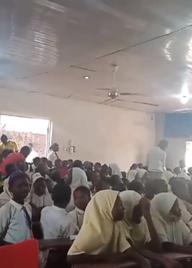 large group of children in a room, likely a school assembly. The children are sitting at desks, mostly wearing white uniforms. Some girls have headscarves. The room has white walls, a tin ceiling with fluorescent lights, and several ceiling fans. There are windows and an open doorway in the background, with people moving in and out. A small trophy is visible on a table in the foreground. There are adults present, walking around and interacting with the children. The overall impression is of a crowded and somewhat noisy gathering.
