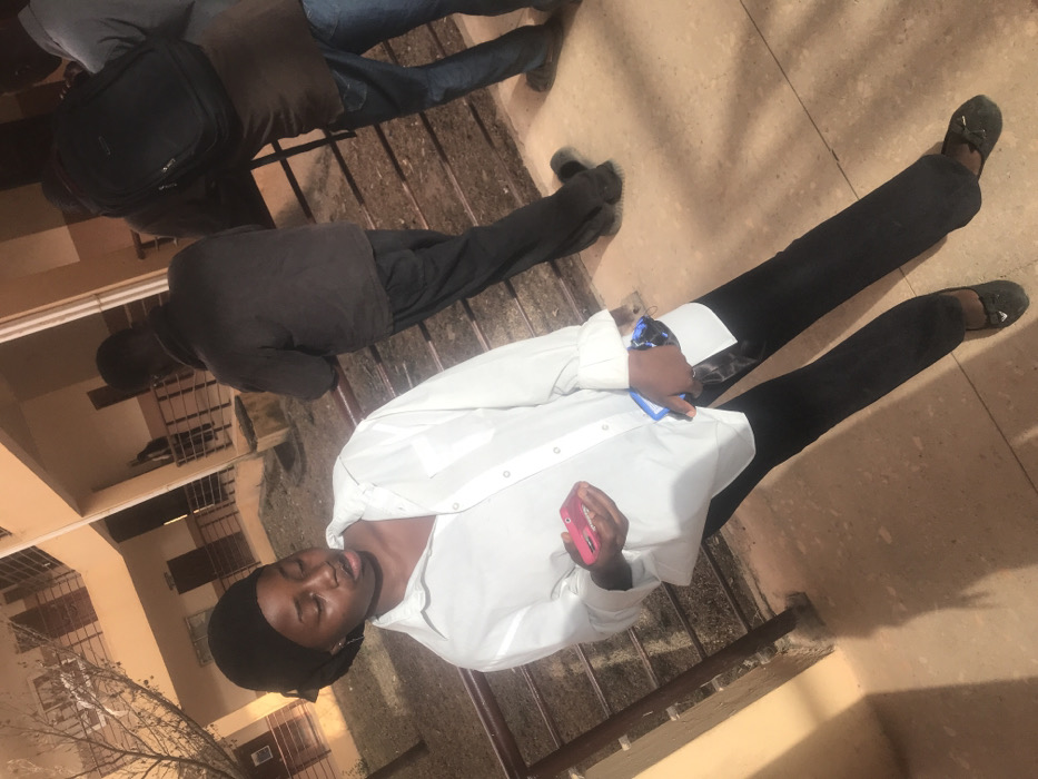 Three people are visible in this somewhat awkwardly angled image. One person stands in the foreground, wearing a white shirt, black pants, a black head covering and holding a pink phone in one hand and a blue phone in the other. Behind him, another person sits on a set of steps, wearing a dark jacket and pants. A third person sits on the steps to the top right and has on a brown jacket and blue jeans.