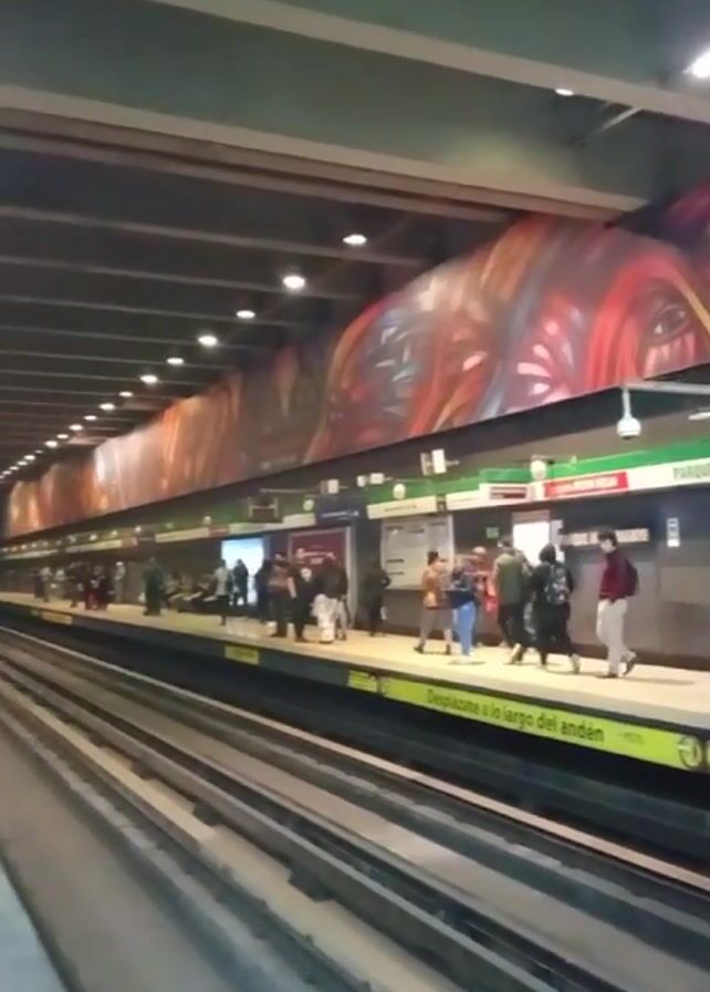 platform of an underground train station. Several people are waiting along the platform. The station is called Parque Bustamante. There is a large mural across the top of the far wall of the station. A train approaches in the distance.