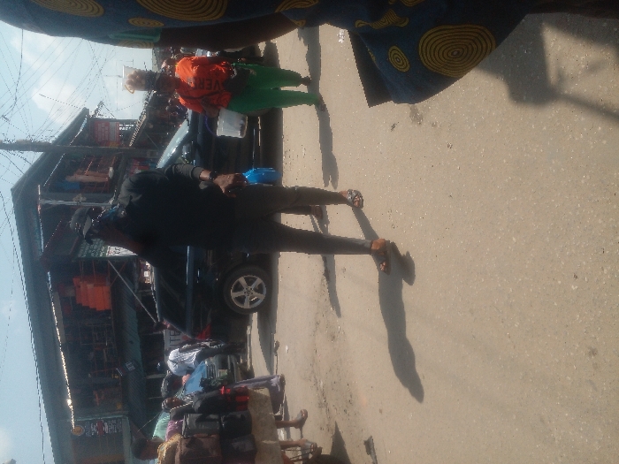 The image depicts a busy street scene in Satellite Town, Nigeria, under bright daylight with visible shadows
