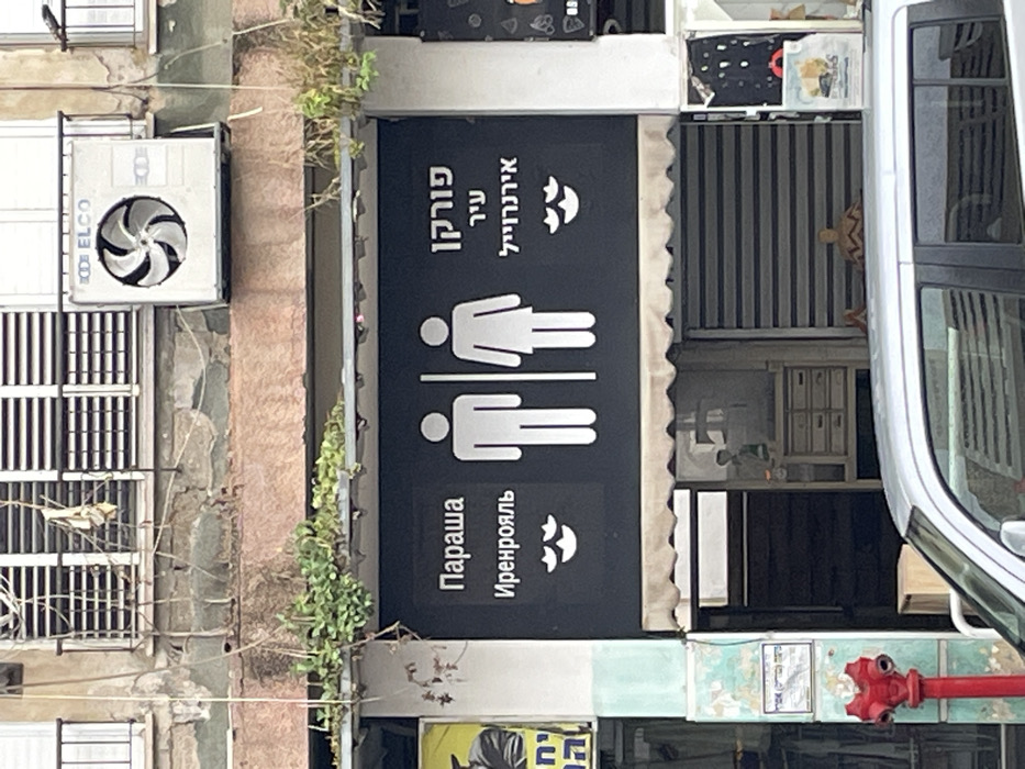The image displays a partial view of a multi-story building facade on an urban street in Bat Yam, Israel, with a silver-colored vehicle partially obscuring the lower foreground. The building's upper story shows a worn concrete surface with peeling paint, a metal balcony railing, and closed horizontal white window blinds. An external ELCO air conditioning unit with a six-bladed fan is mounted below the balcony, to the right. Green vines and weeds grow along ledges and cracks on the facade. Below the upper story, a prominent black rectangular sign features white male and female pictograms, separated by a vertical line, positioned centrally. To the left of the pictograms, white Cyrillic text reads "Параша" (Parasha) over "Иренрояль" (Irenroial), followed by a stylized white mustache icon. To the right of the pictograms, white Hebrew text reads "פורקן" (Purkan) over "עיר" (Ir) over "אירנרויל" (Irenroil), also followed by a stylized white mustache icon. A beige scalloped awning extends beneath this sign. At ground level, beneath the left portion of the sign, is a glass storefront entrance. A faint reflection of a person and a light-colored wooden cabinet with multiple drawers are visible inside. To the far left, a red fire hydrant stands on the sidewalk. Beneath the right portion of the sign, a closed horizontally corrugated metal roll-down security shutter covers another storefront. A patterned object with yellow and brown zigzags is partially visible at the bottom of the shutter. The silver vehicle in the foreground obscures the lower parts of the ground-level shops and the immediate sidewalk, showing its side window and roof line.