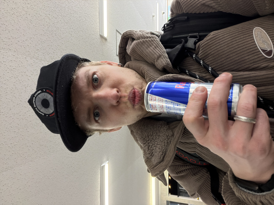 A fair-skinned man with light hair and blue eyes wears a black baseball cap and brown corduroy jacket. He holds a blue and silver Red Bull can near his pursed lips, gazing directly at the camera. A black backpack is slung over his shoulder. He wears a textured silver ring on his finger. The background features a white wall with rectangular light fixtures.