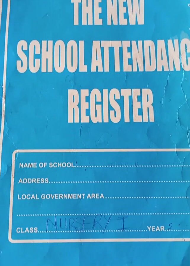 The video displays a close-up of the cover of a school attendance register