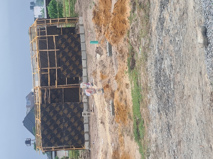 The image depicts an active construction site in Lekki, Nigeria, under an overcast sky. The central subject is a partially erected structure, approximately two stories high, featuring a wooden framework of bamboo poles and lumber. The lower portion of the walls is clad with a dark, patterned waterproof membrane or building wrap, displaying a repeating gold symbol. The structure rests on a foundation constructed from grey concrete blocks. No roof is present, exposing the skeletal wooden roof support. In the mid-ground, the sandy, disturbed earth features several mounds of reddish-brown soil, consistent with excavation. Two white sacks, possibly containing building materials, are positioned upright near the base of the main structure, wrapped in translucent material. A single green pipe vertically protrudes from the ground nearby. Scattered concrete debris and small patches of green vegetation are visible across the soil. The immediate foreground consists of a textured ground surface, primarily gravel and compacted dirt, with a larger, irregular grey stone resting on the gravel to the right. In the background, beyond the construction area, other finished buildings are visible. To the left, a structure with a dark, sloped roof is topped by a dark cylindrical water tank mounted on a raised wooden platform. Further to the right, a white building is partially obscured by vegetation and the construction. No individuals or active work are discernible within the frame.