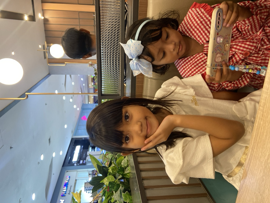 Two young Indonesian girls are seated at a light-colored wooden table within a dining establishment at Lippo Plaza Sidoarjo, Indonesia