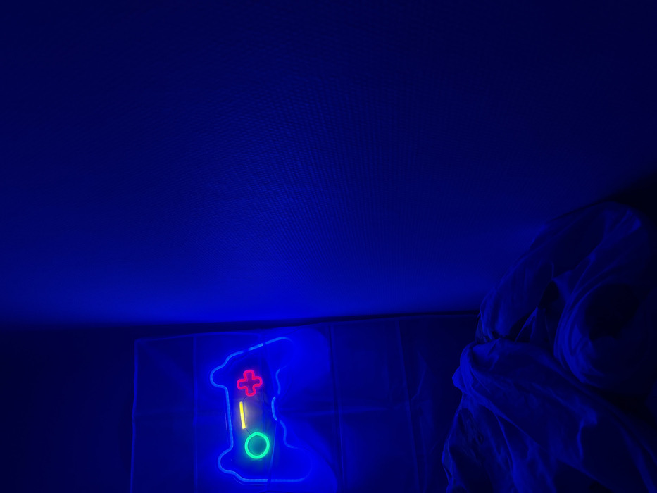 A neon sign shaped like a game controller glows brightly in a room illuminated by blue light