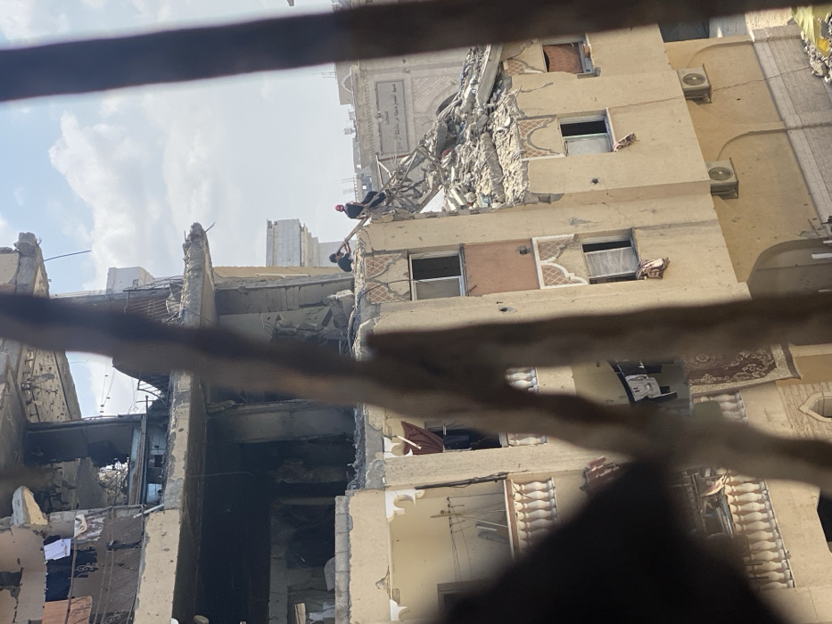 The image captures a scene of extensive urban destruction in Khan Yunis, Palestinian Territory, viewed through blurred foreground elements suggesting a window frame or bars