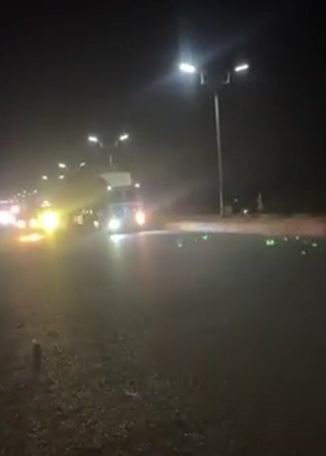 At night, a line of vehicles drives on a road illuminated by streetlights. The first vehicle appears to be a large truck, followed by other cars. The camera stays stationary throughout the shot.