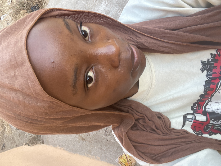 A woman wearing a brown hijab looks directly at the camera with a slight tilt of her head. Her skin is dark with a sheen, and her lips appear moisturized. She wears a white shirt with a red and black graphic design. The background consists of an out-of-focus outdoor environment, partially concrete.