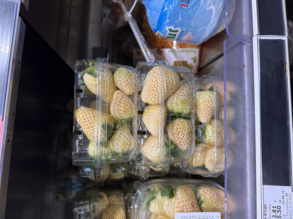 The image depicts a static indoor scene within a retail environment, specifically a refrigerated section of a grocery store or supermarket in Burgas, Bulgaria. The primary subjects are multiple clear plastic clamshell containers, each filled with white strawberries (pineberries), stacked vertically on a metallic shelf. The strawberries are distinctively off-white to pale yellow with prominent red achenes and some visible green calyxes. Below the stacked containers, a white price tag with black text is affixed to the shelf. It displays "БРУТО ЦЕНА" (Gross Price), "ЯГОДИ" (Strawberries), a price of "2.81 лв" (Bulgarian Lev), and a unit price of "21.96 лв" per unit (likely kilogram), along with a barcode "384100" and a date "19.02.2026." To the right of the stacked strawberry containers, partially visible blue packaging for a product identified as "Tnut" or similar, bearing "foodservices" branding and stating "From Vietnam" with a temperature recommendation of "2°C," is present on an adjacent shelf. The background consists of dark, metallic shelving, suggesting a commercial refrigeration unit. No individuals are visible.