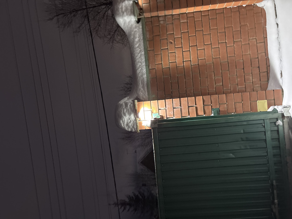 This forensic description pertains to an image taken at night in the city of Ферма, Russia, during winter conditions. The scene primarily depicts an exterior view of a snow-covered fence and gate. In the foreground, a dark green, vertically corrugated metal gate is partially visible on the left, appearing slightly ajar. To its right, a reddish-brown brick fence pillar stands, illuminated by an active, warm yellow-orange light fixture mounted on its side. Above the light, and extending across the top of the adjacent brick fence to the right, is a thick, uneven layer of accumulated snow, forming rounded contours. The brick fence continues out of frame to the right. Snow also covers the ground in the lower portion of the image, accumulating against the base of the gate and the brick structures. A small, yellow rectangular element is affixed to the brick pillar near the bottom of the gate. The background reveals a dark, overcast night sky with multiple parallel utility wires stretching horizontally across the upper frame. Silhouettes of bare deciduous trees and a single coniferous tree are visible against the sky. Further in the background, a house roof, partially snow-covered, with an antenna, can be discerned beneath the treeline. No individuals, animals, or overt actions are present in the image.