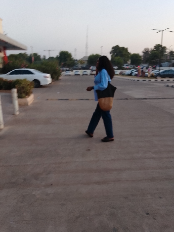 A woman with long dark hair walks across a paved area. She wears a light blue top, dark pants, and dark shoes. A large tote bag hangs from her shoulder. In the background, there are parked cars, trees, and buildings. The sky is a light shade, suggesting it might be early morning or late afternoon. The image has a slight blur.