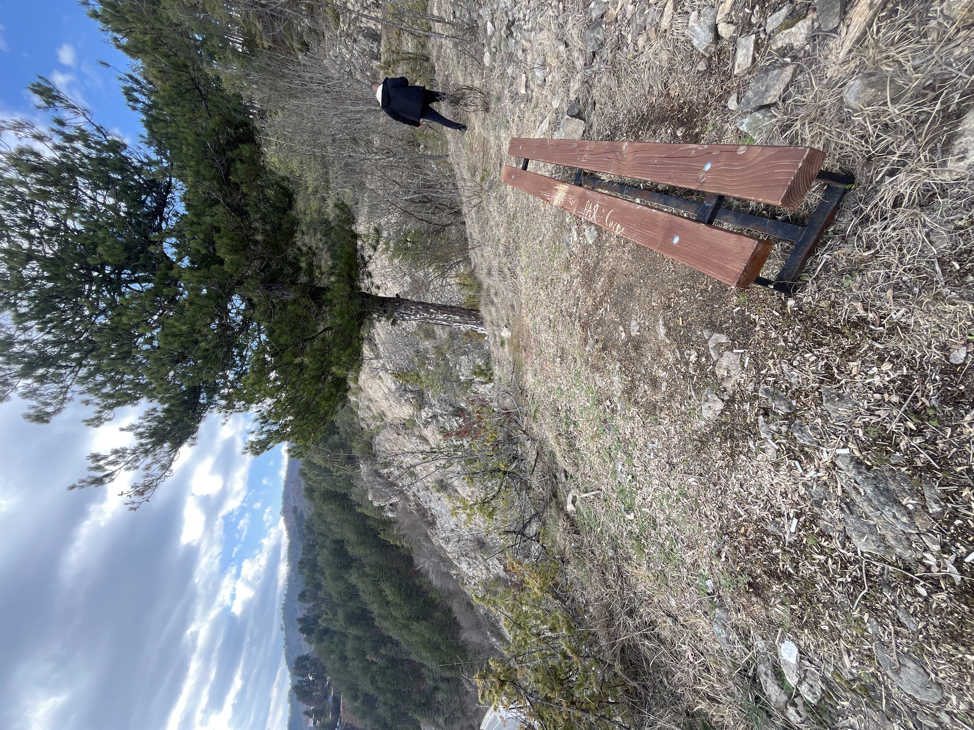 The image displays a rugged hillside view in Srednogortsi, Bulgaria, under a sky with both blue patches and elongated grey clouds. In the immediate foreground, a wooden bench with two reddish-brown slats and black metal supports is situated on uneven ground composed of dry grass, dirt, and scattered rocks. The left slat of the bench shows some surface markings or carvings. A lone individual, seen from behind, is walking uphill and to the right on a discernible dirt path. This person is dressed in a dark jacket with a visible light-colored lining around the hood/collar, dark trousers, and dark footwear. To the left of the path, a prominent pine tree with dense green needles stands. The midground features a steep, rocky slope descending to the left, at the base of which a segment of a paved road is visible. Beyond this, a vast coniferous forest covers multiple rolling hills, with distant mountains and faint architectural structures appearing on the horizon. The surrounding environment includes numerous bare deciduous trees and shrubs, suggesting a late autumn, winter, or early spring period.