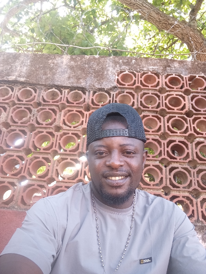 A medium close-up outdoor photograph depicts an adult male in what appears to be a selfie or headshot. The subject is a dark-skinned male with a short dark beard and a smiling expression, looking directly at the camera. He wears a dark-colored mesh baseball cap reversed, with the brim facing backward. His attire includes a light grey or tan short-sleeved collared shirt featuring a small "National Geographic" logo on the left chest, and a long, multi-beaded silver-toned necklace. The background consists of a weathered reddish-brown wall constructed from patterned, perforated concrete blocks arranged in a grid of octagonal shapes with circular apertures. Above this, a rough concrete coping is visible, topped by a single strand of barbed wire running horizontally. Green tree leaves and branches are visible above the wall, suggesting an outdoor environment under daylight conditions. The specific location within Jos, Nigeria, is not discernible from the visual evidence.
