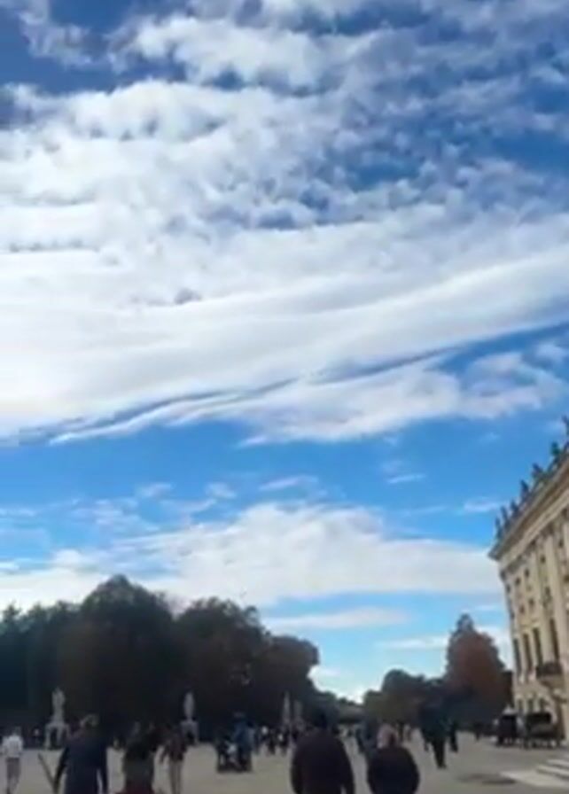 low angle view of Schönbrunn Palace in Vienna, Austria. The sky is blue with white clouds. People are walking around the palace grounds. The video pans around showing the large open area in front of the palace with a gravel path and trees on the side. As the camera pans around, the sky becomes more cloudy.