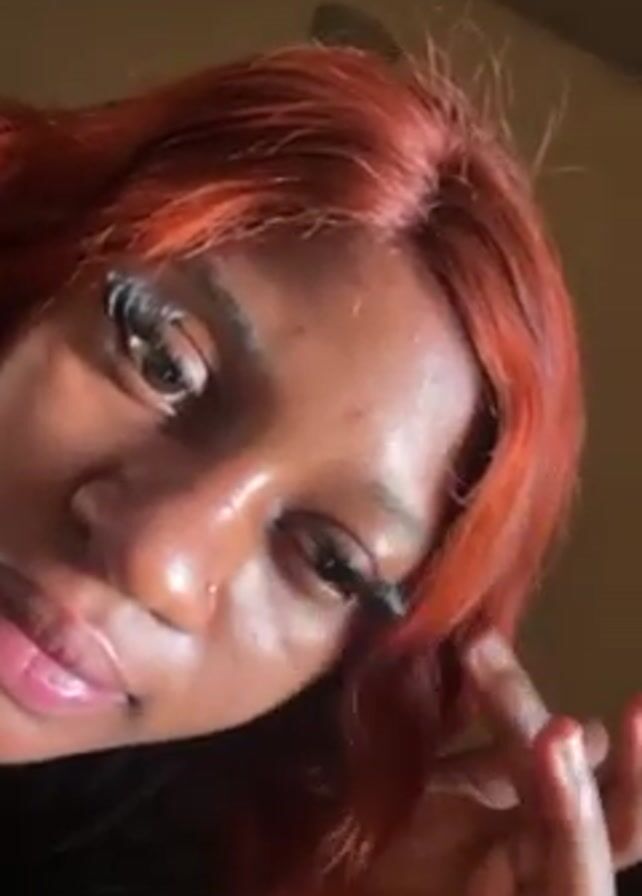 A close-up, low-angle shot shows a woman with brown skin and reddish-orange hair looking directly at the camera. She has large, dark eyes with long eyelashes, and a small nose piercing. Her hand is raised near her eye, and she appears to be adjusting her eyelashes. The background is a plain, light brown wall. The lighting suggests an indoor setting. The music playing in the background is audible.