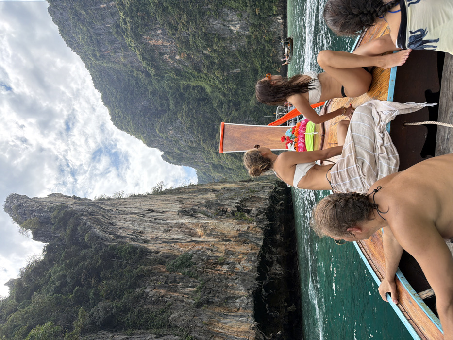 A longtail boat navigates emerald waters near towering, vegetation-covered cliffs under a sky with broken clouds. Four fair-skinned individuals are on board. Two women are in white bikini tops, one with a tan towel draped. A fourth woman is partially visible. A shirtless man looks over the edge. Brightly colored flowers decorate the boat's bow.