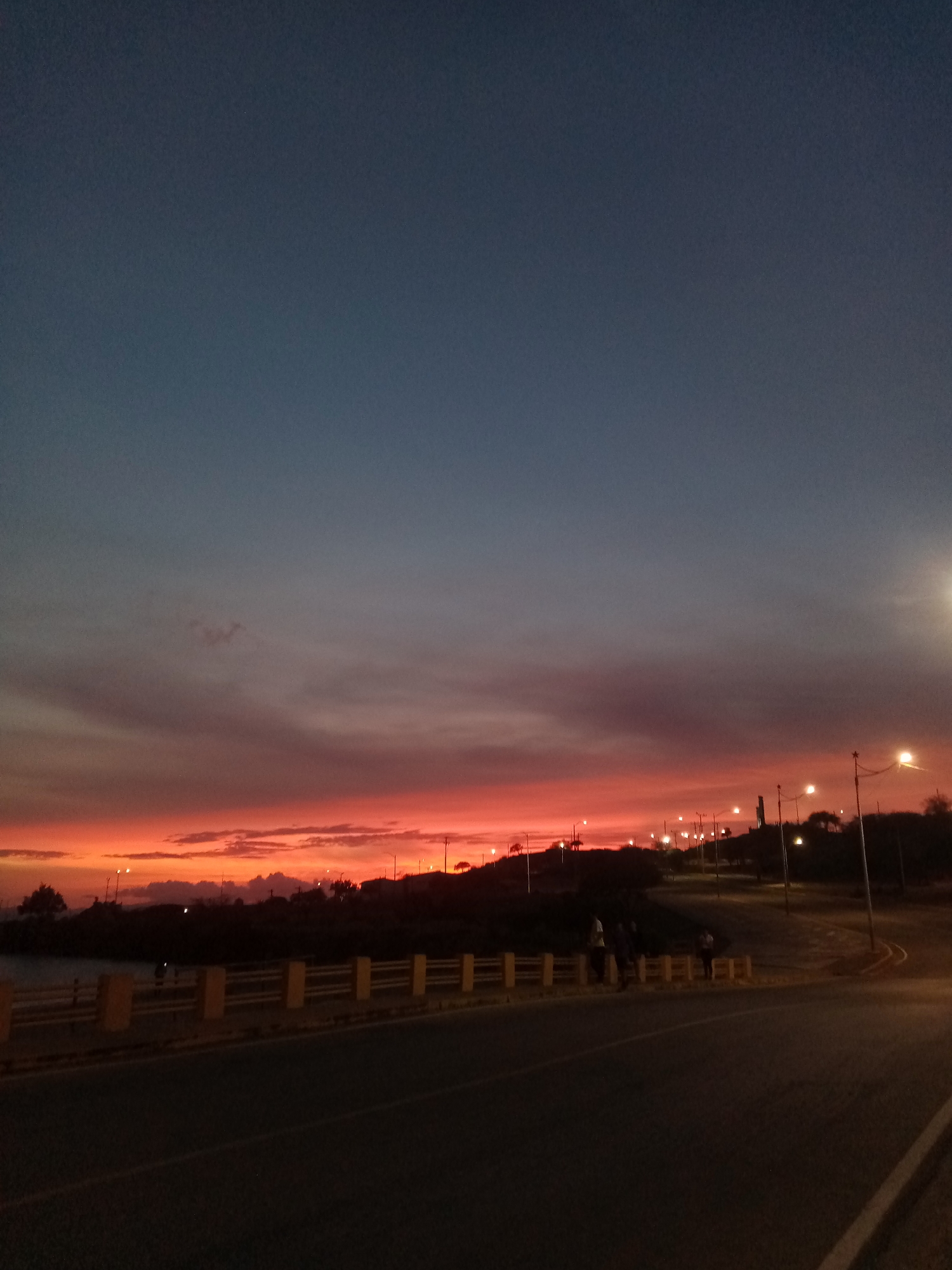 The image depicts an urban landscape at dusk in Juan Griego, Venezuela. The sky exhibits a gradient of color, transitioning from a deep blue at the top to a vibrant red-orange near the horizon. The horizon line is punctuated by a silhouette of land, featuring trees and the outlines of buildings. Streetlights are visible along the road, emitting a warm glow. A road occupies the foreground, curving into the distance. A yellow guardrail runs along the left side of the road, separating it from a body of water. Three people stand beside the road, interacting. The scene is illuminated by a combination of natural light from the sunset and artificial light from the streetlights, creating a low-light environment.